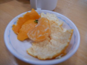 デザートのみかんは、自分でむいて食べます。