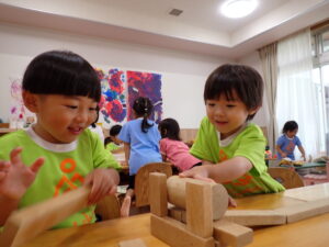 つみ木はおともだちと力を合わせて・・・建物沢山のになったり、転がる積み木のコースになったり!