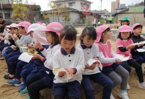みんなで肩を並べて座り、早速できたてのやきいもをいただきました。