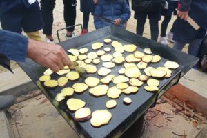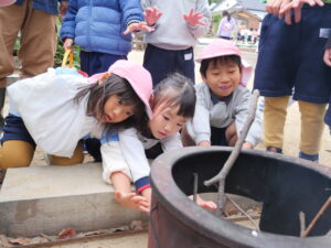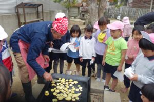 火がいい感じに燃えてきたら、大きな鉄板でさつまいもを焼きます。実はこのさつまいも、先日年長組のみんなが収穫したばかりのものなんですよ♪
