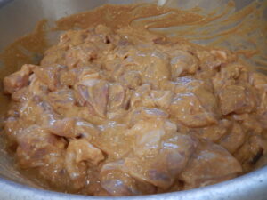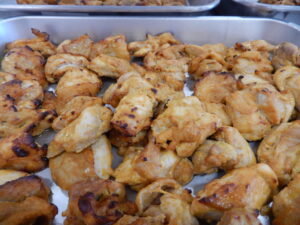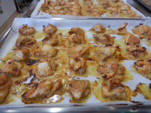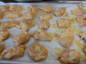 給食だよりで紹介していた「タンドリーチキン」です。 鶏もも肉をヨーグルト、ケチャップ、カレー粉を混ぜ合わせたものに、一時間くらい 漬け込んで、コンベクションオーブンでこんがり焼きます。