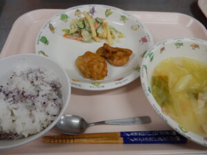 とってもジューシーに焼き上がり、こどもたちもよく食べてくれました。 この日の献立は、ゆかりご飯、タンドリーチキン、マカロニサラダ、野菜スープです。