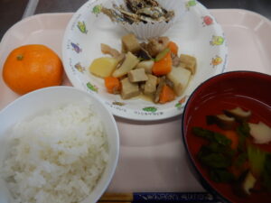 ご飯、筑前煮、田作り、正月風すまし汁、みかんの組み合わせです。