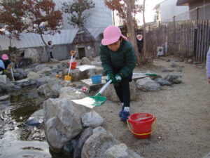「ビオトープの氷を割れないように…」 「あっ、割れちゃった」