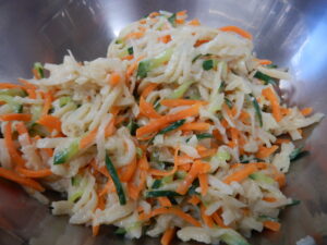 胡瓜と人参と共に、マヨネーズ、味噌、すりごまを混ぜたソースで和えます。