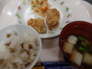 節分の日の献立は、豆まきに使う煎り大豆を使った「節分ご飯」でした。