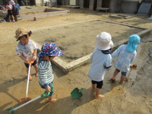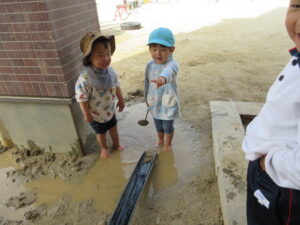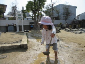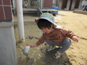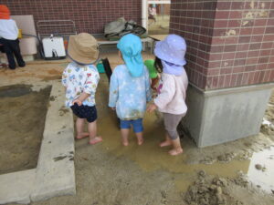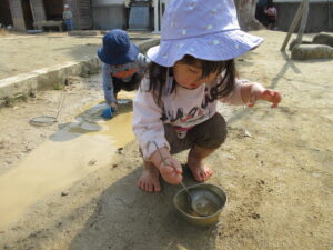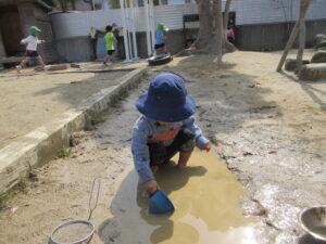 外に出ると、さっそく水たまりを発見!!自分で靴を脱いで、裸足になってあそび始めました。