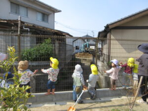 何やら柵の所にこどもたちが…